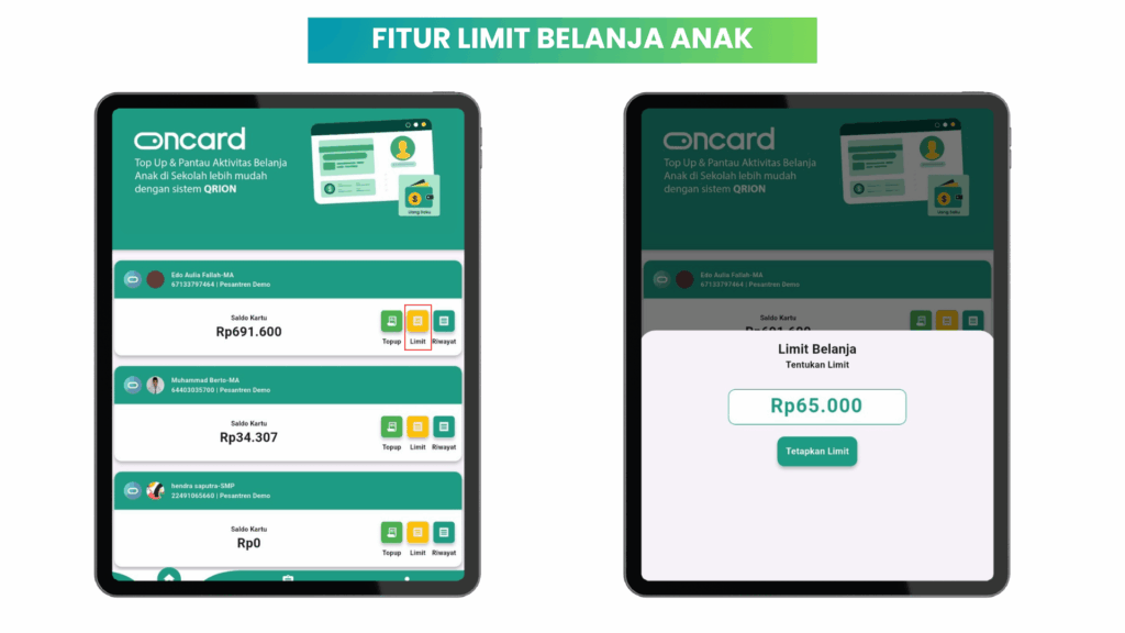 Salah satu fitur unggulan dalam implementasi Oncard sebagai sistem cashless adalah kemampuan untuk melakukan pengaturan limit belanja siswa secara fleksibel dan terkontrol.